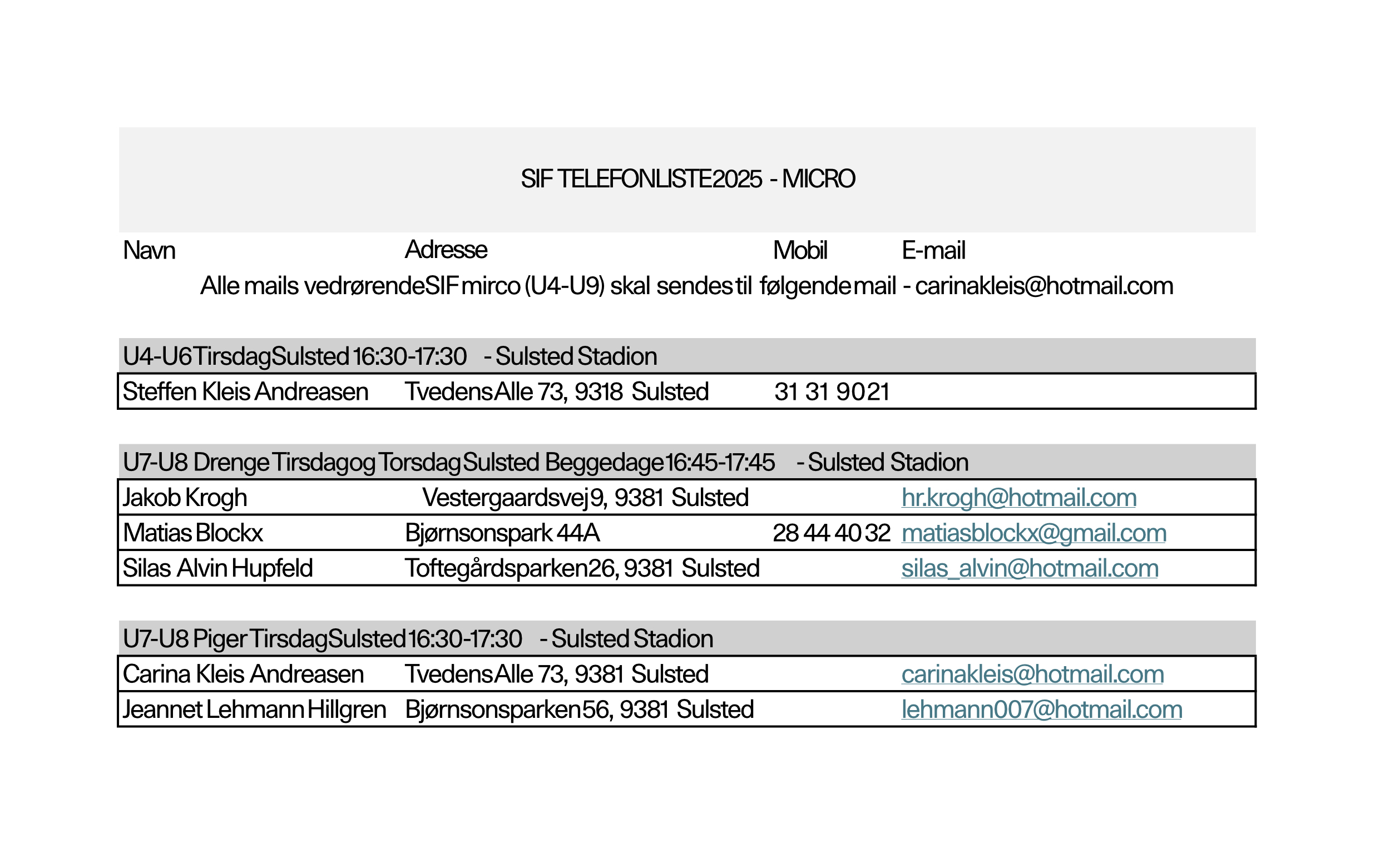 TSV - Telefonliste og træningstider